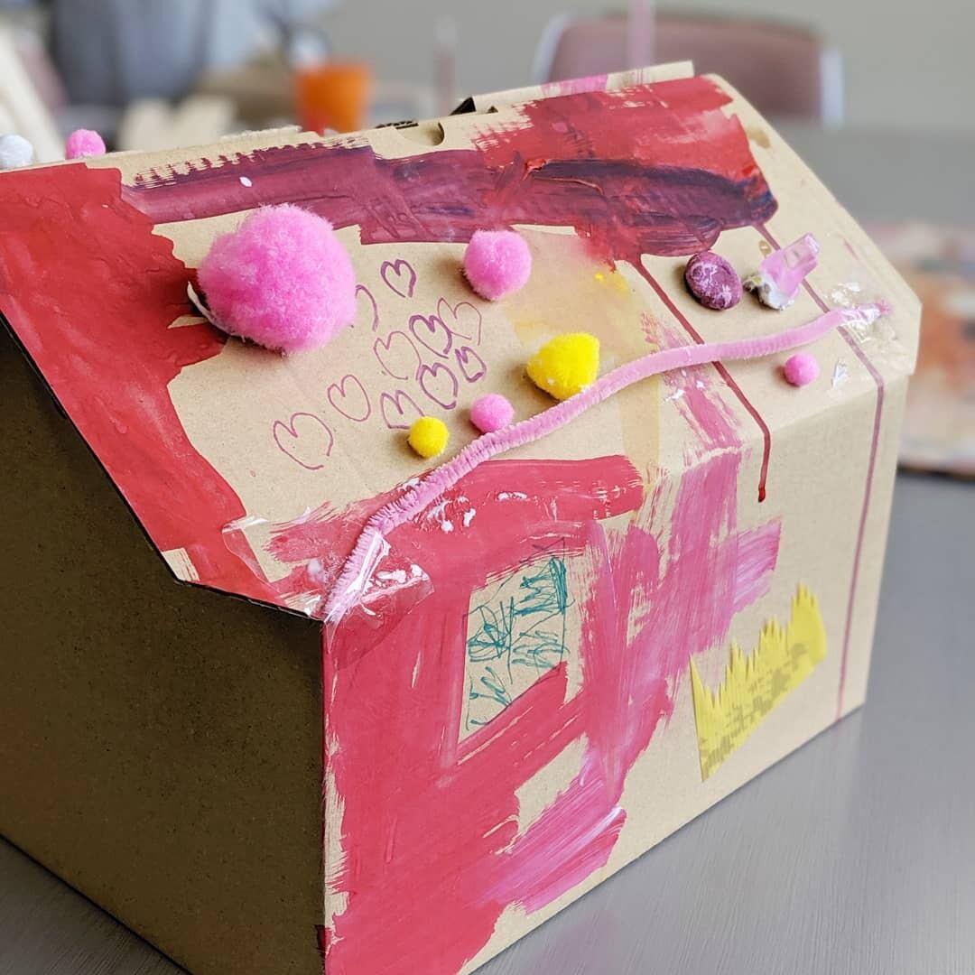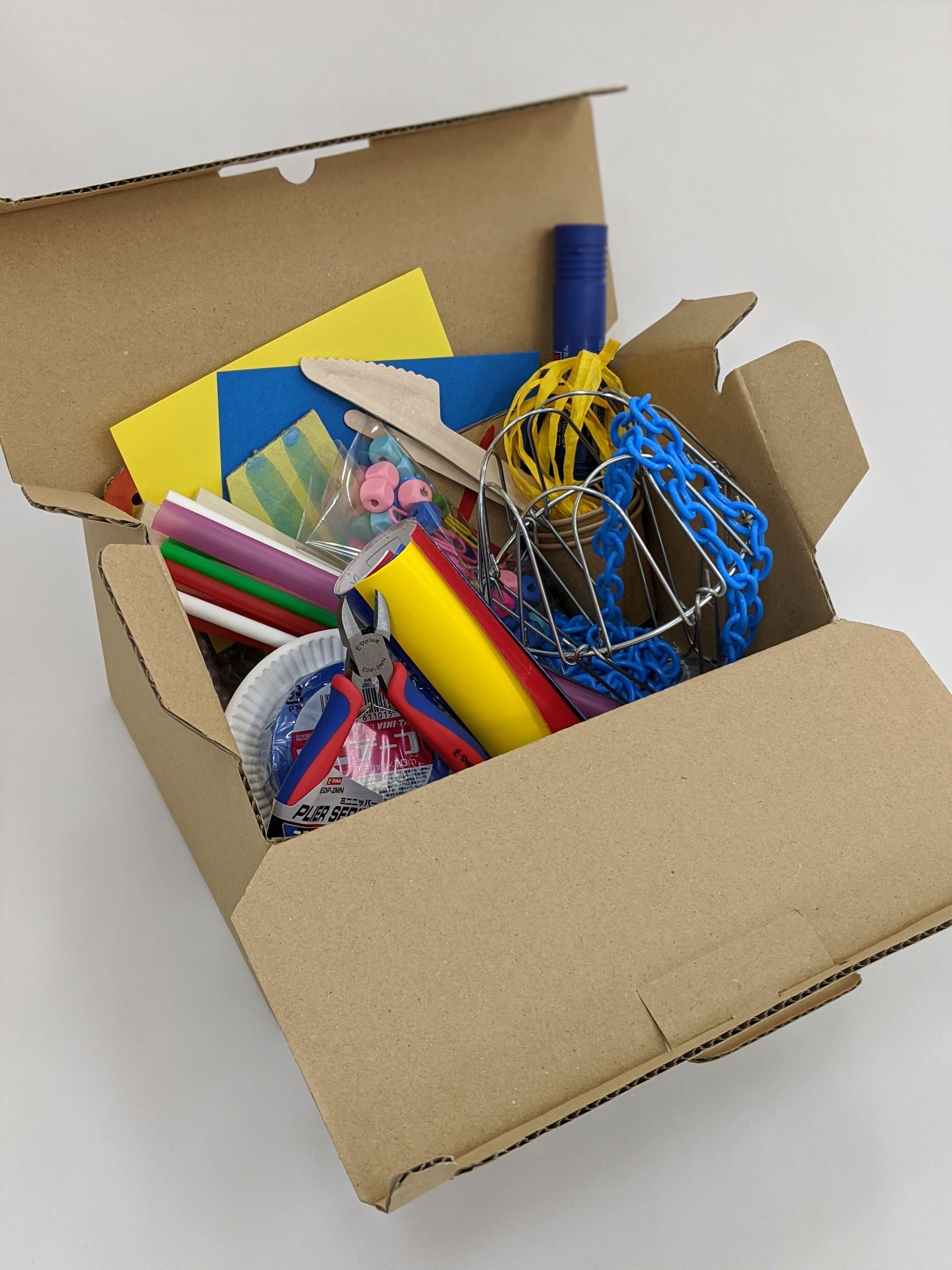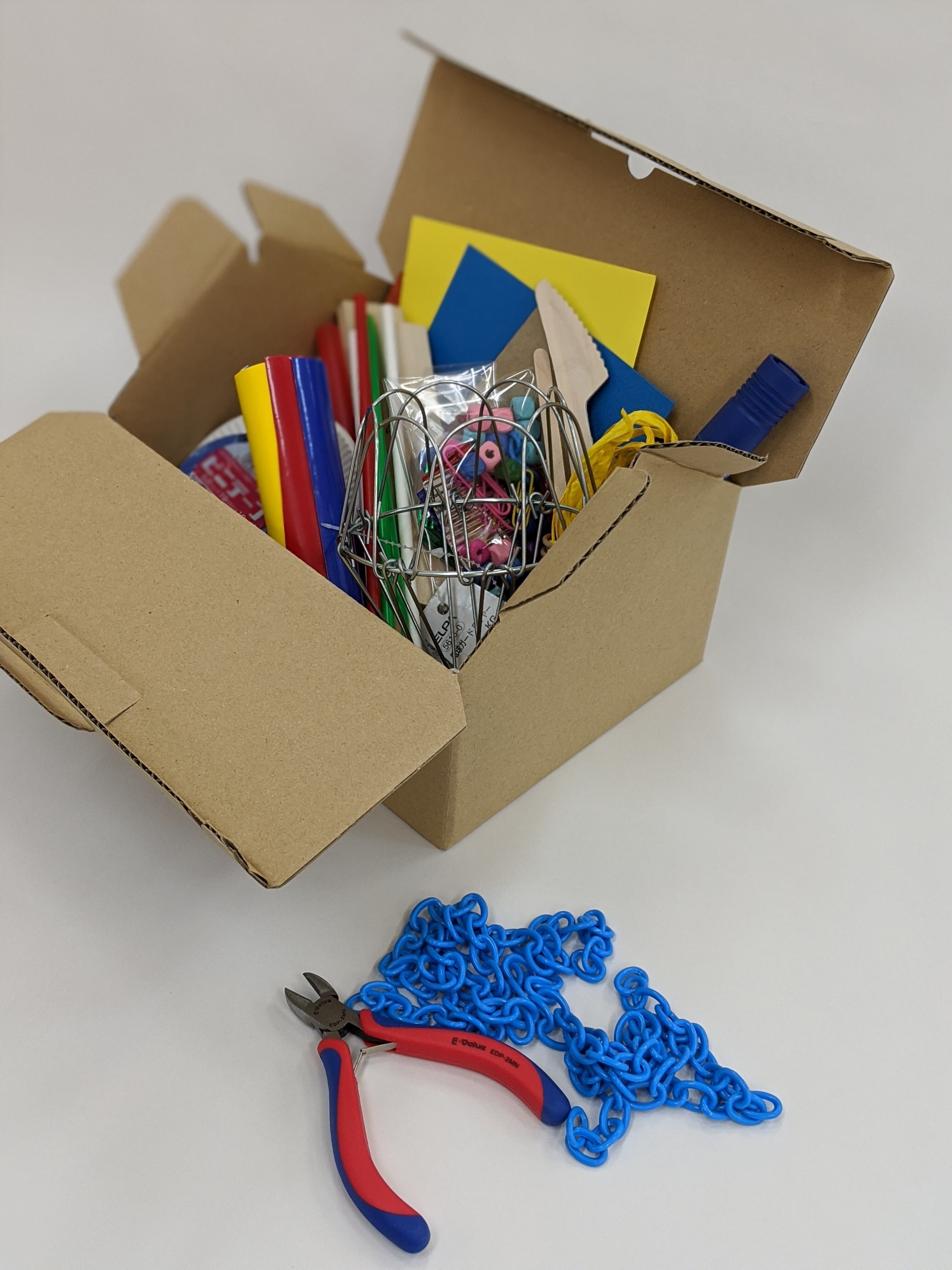 おうち型の段ボールの中に”どうぐ”と”ざいりょう”がたくさん入っています。使い方はみんな次第!