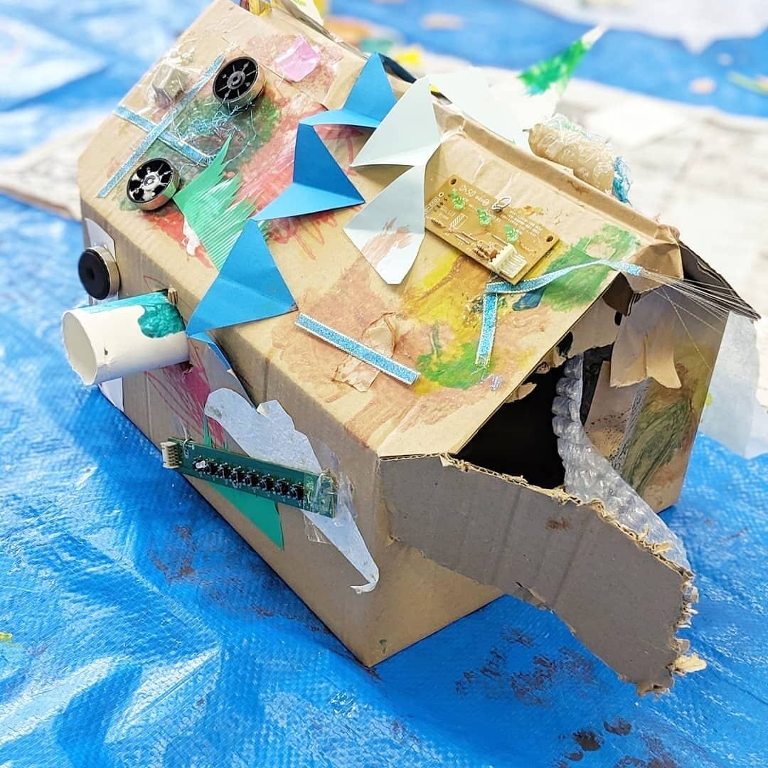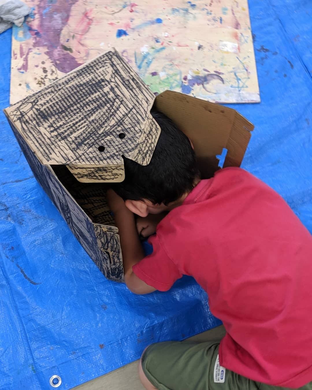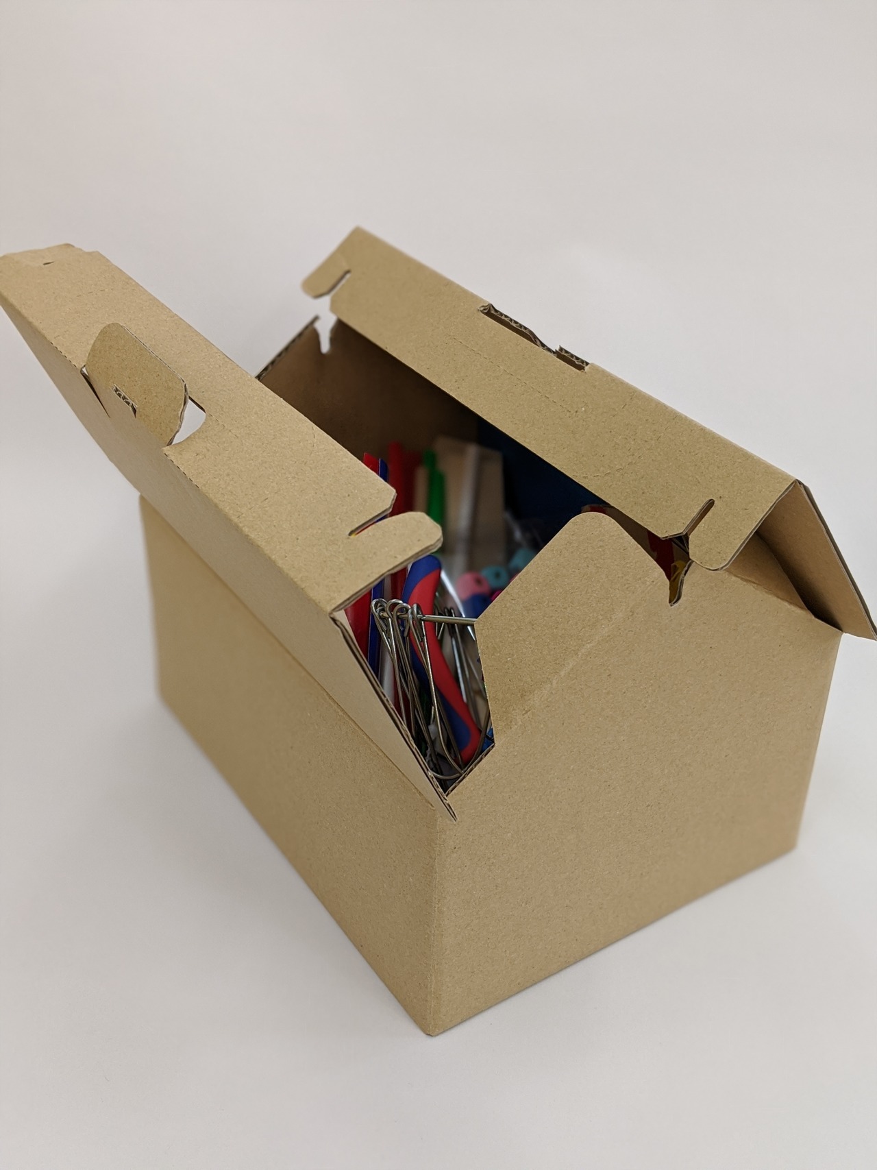 おうち型の段ボールの中に”どうぐ”と”ざいりょう”がたくさん入っています。使い方はみんな次第!