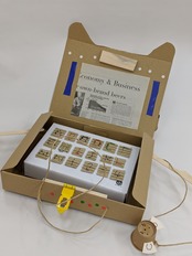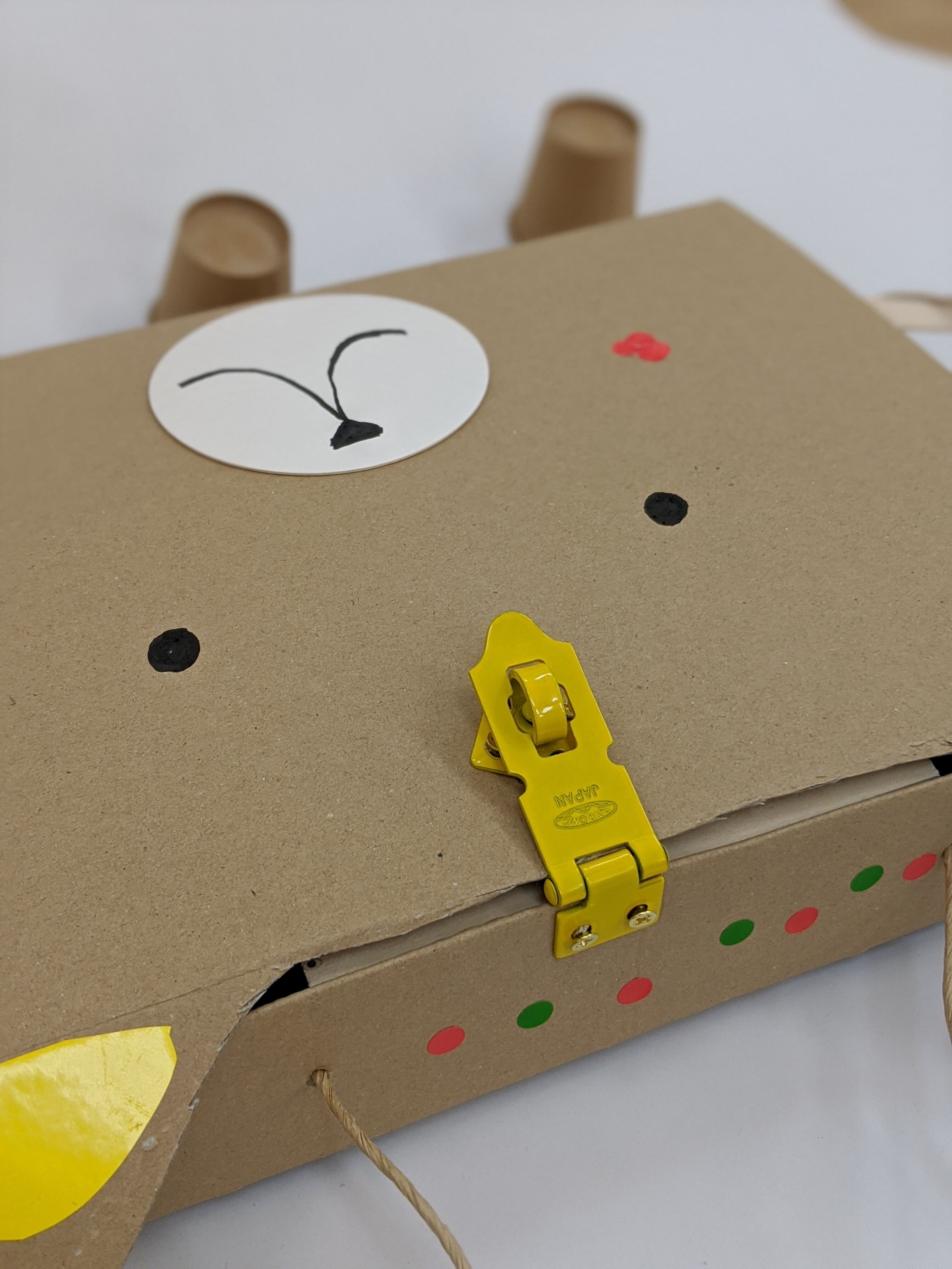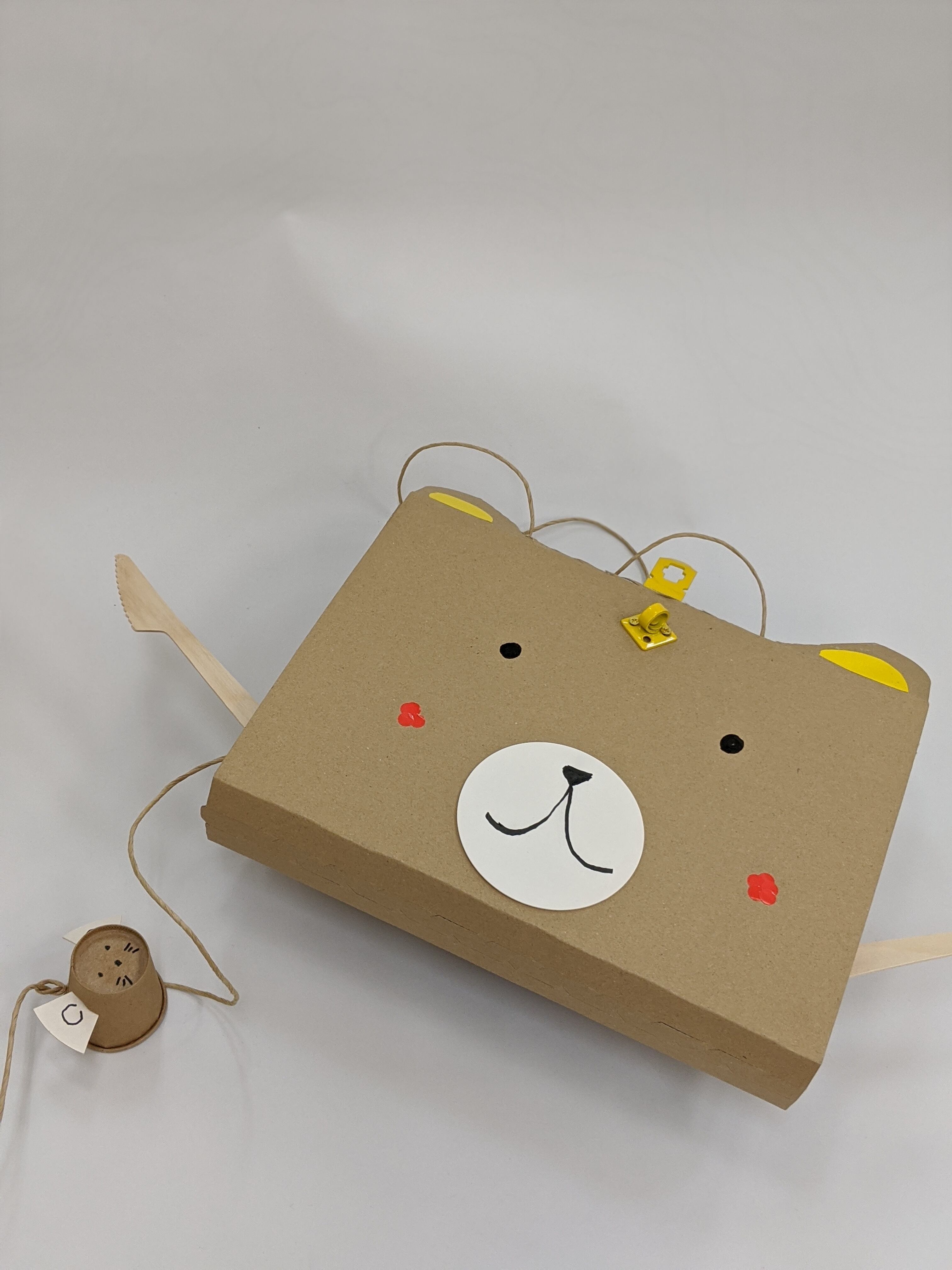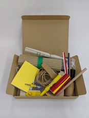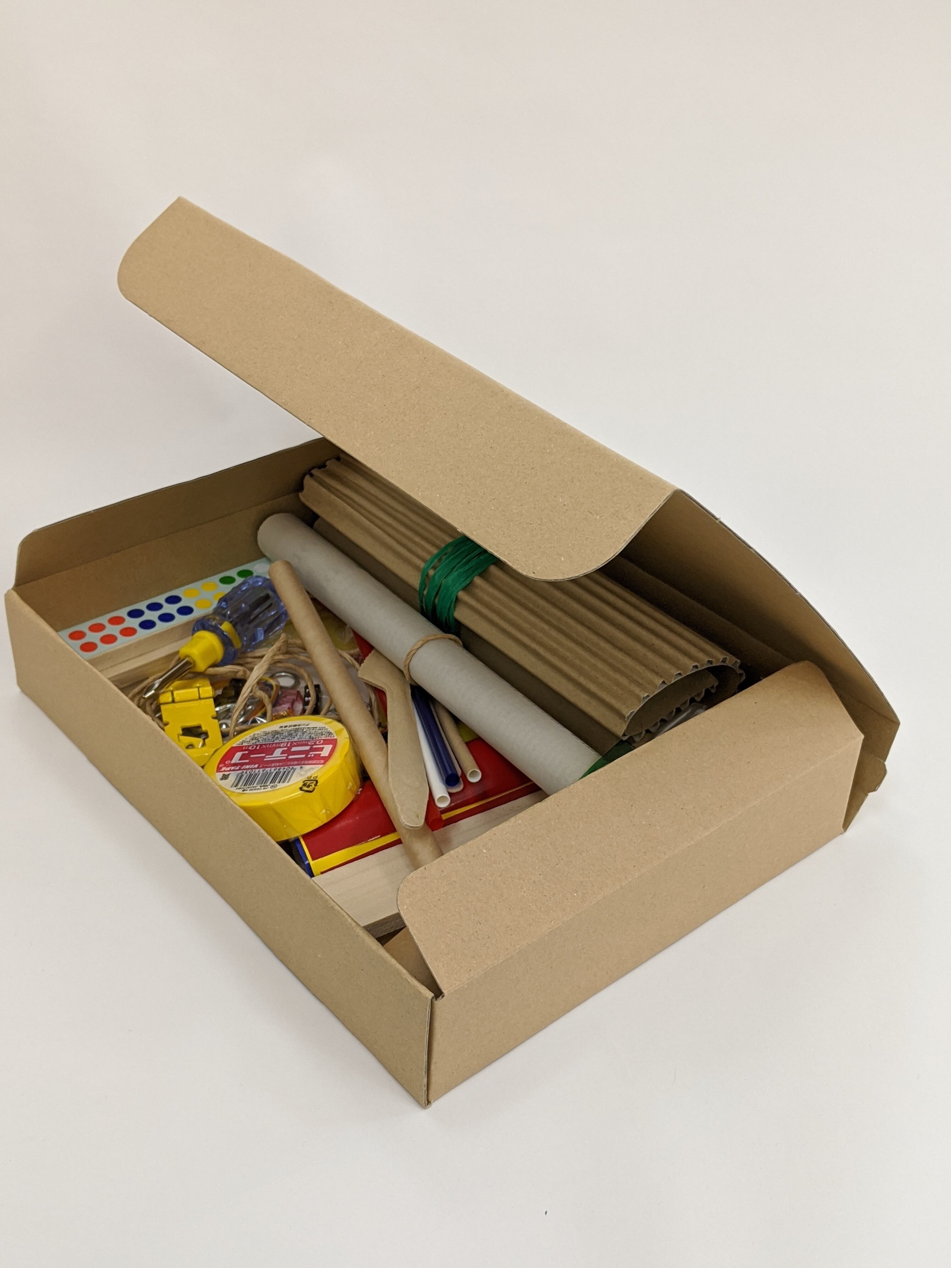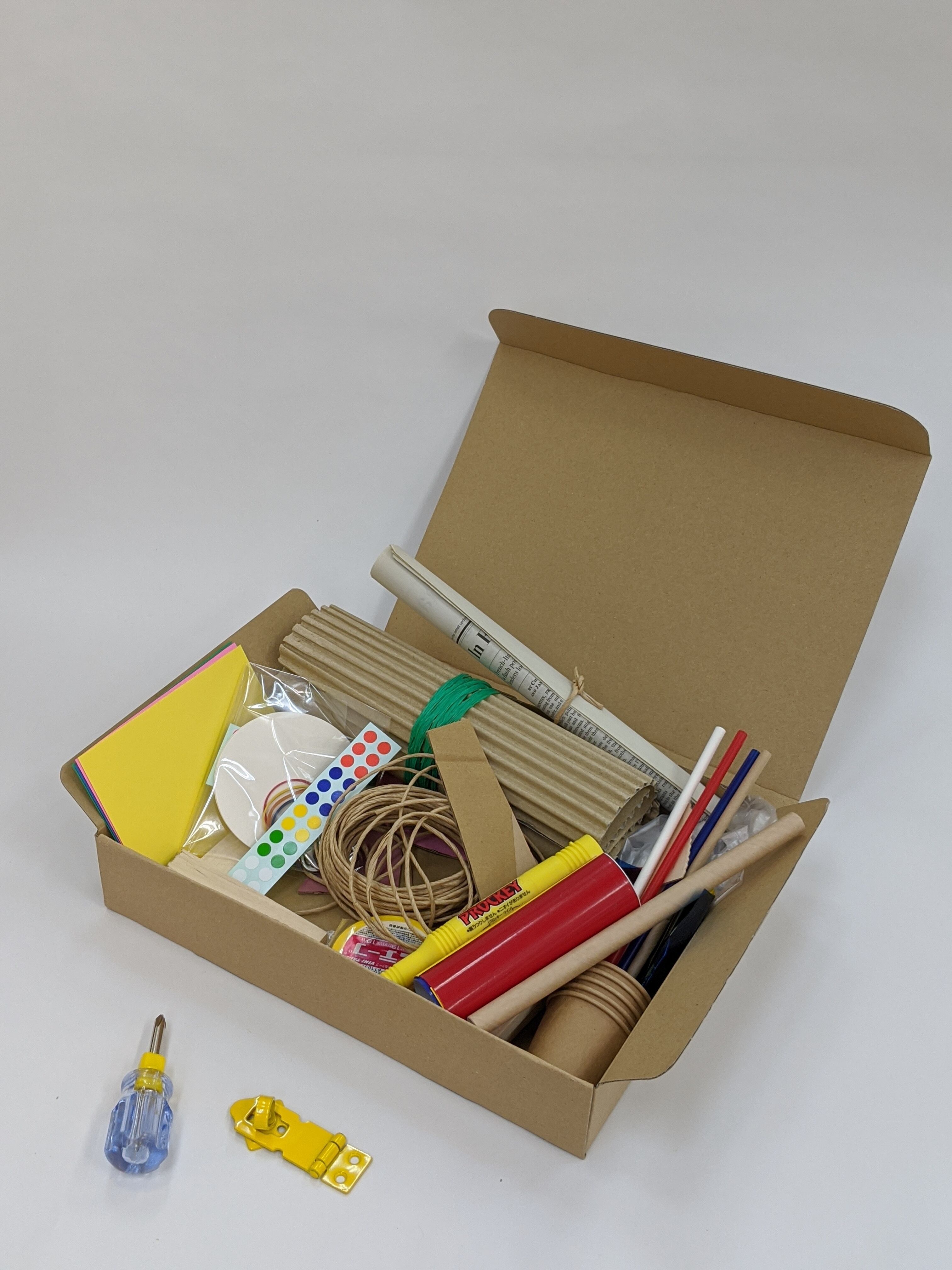 ぶっく型の段ボールの中に”どうぐ”と”ざいりょう”がたくさん入っています。使い方はみんな次第!