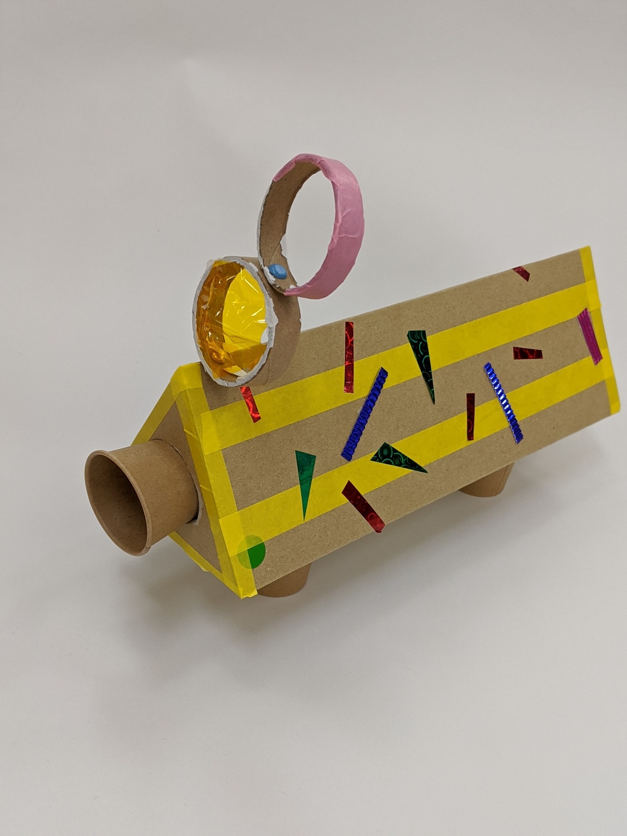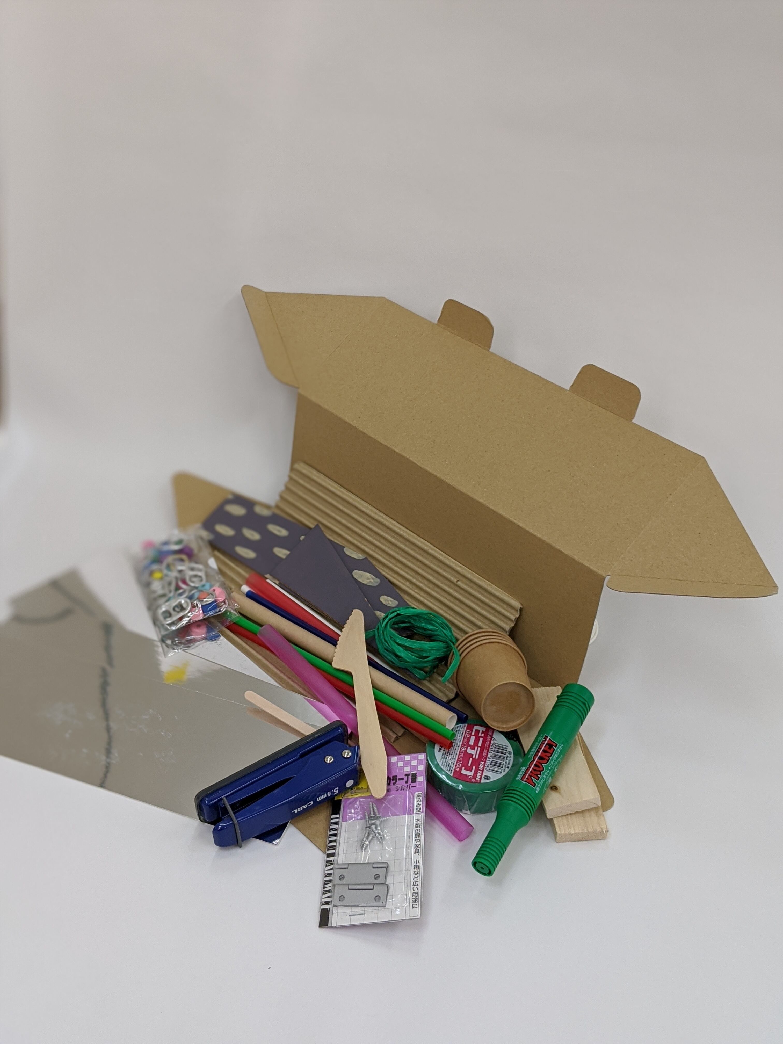 さんかく型の段ボールの中に”どうぐ”と”ざいりょう”がたくさん入っています。使い方はみんな次第!